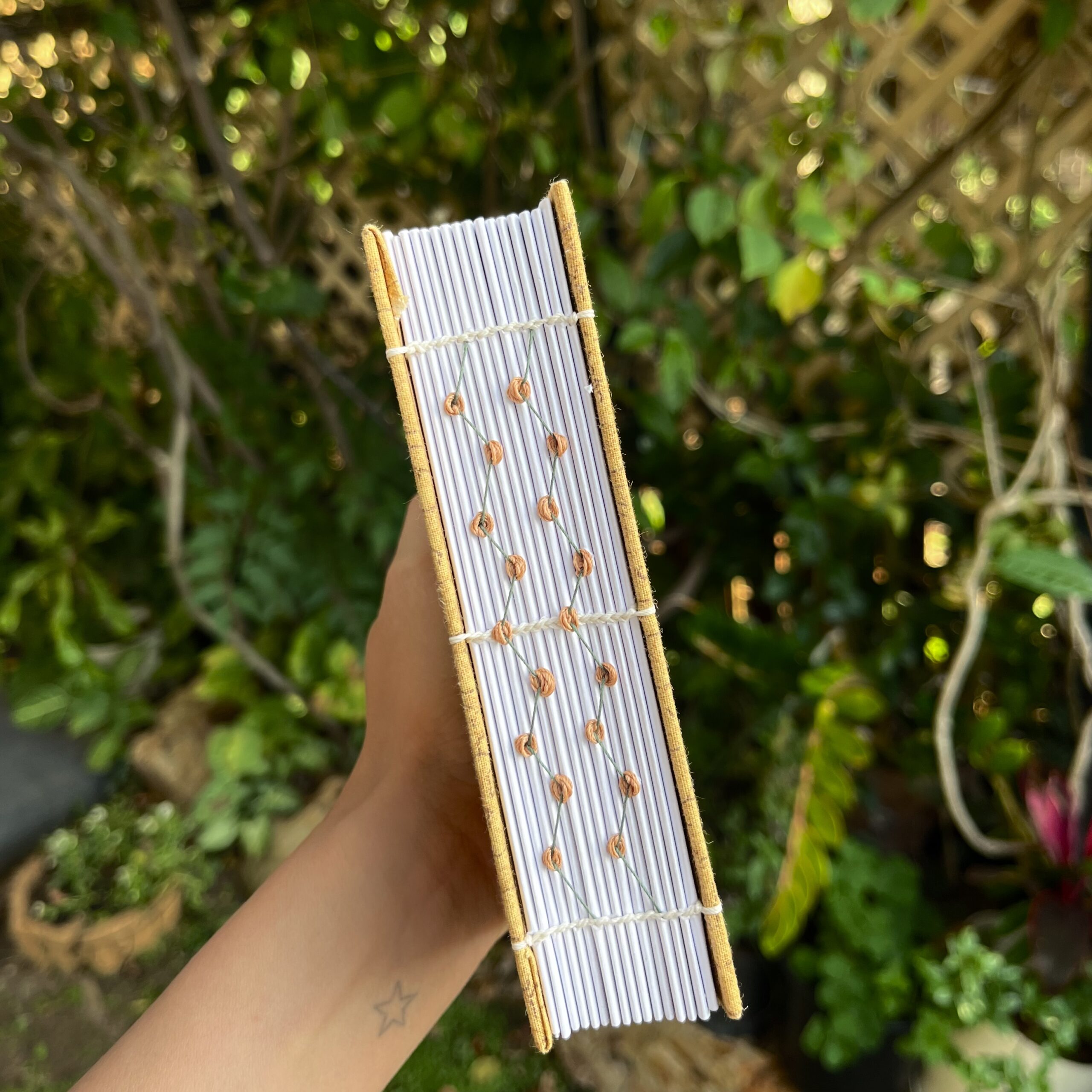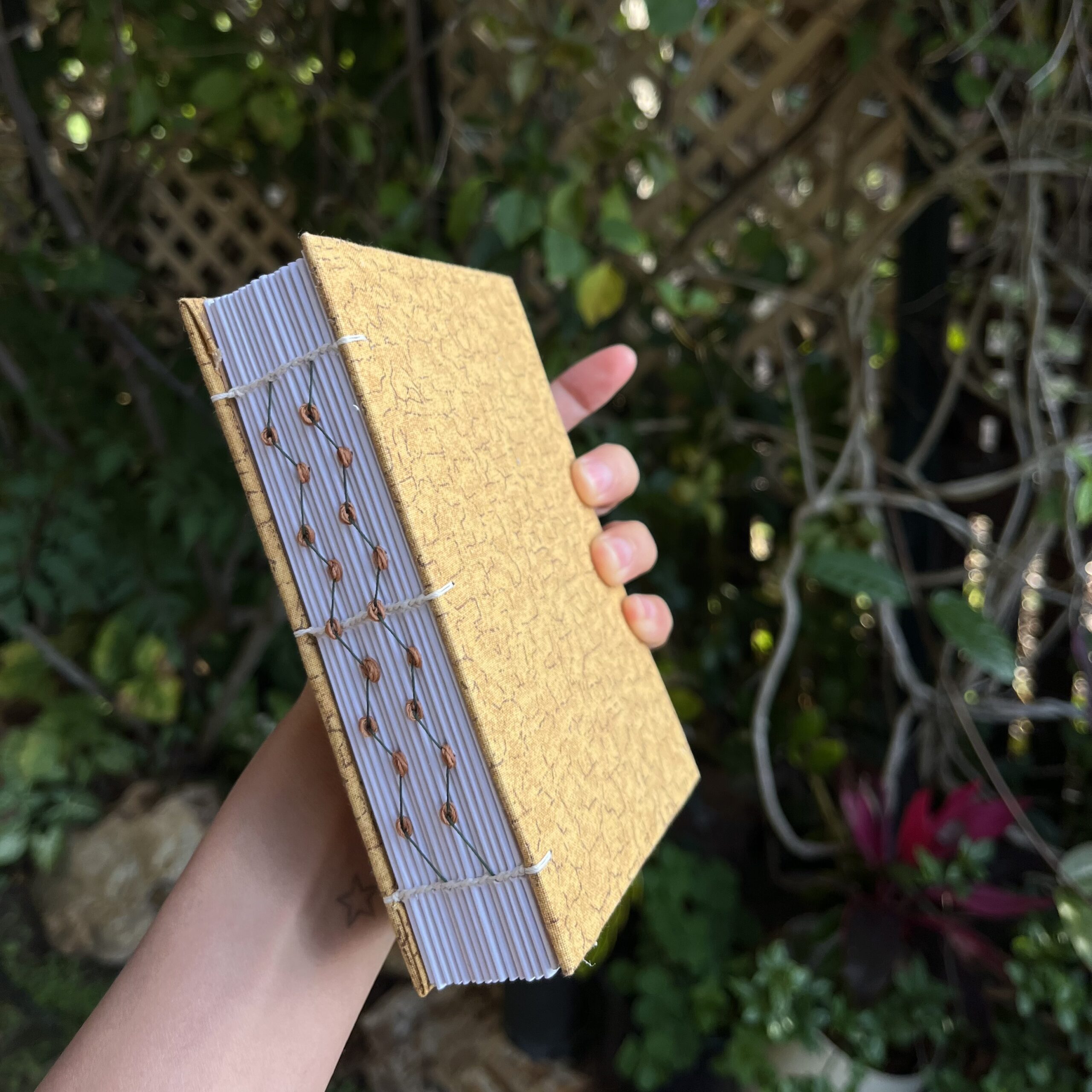 The journal is called “Gold Rice Fields” because the fabric’s color and pattern remind me of golden rice fields during harvest season in Vietnam (my home country). The lines on the fabric resemble the borders between rice paddies.