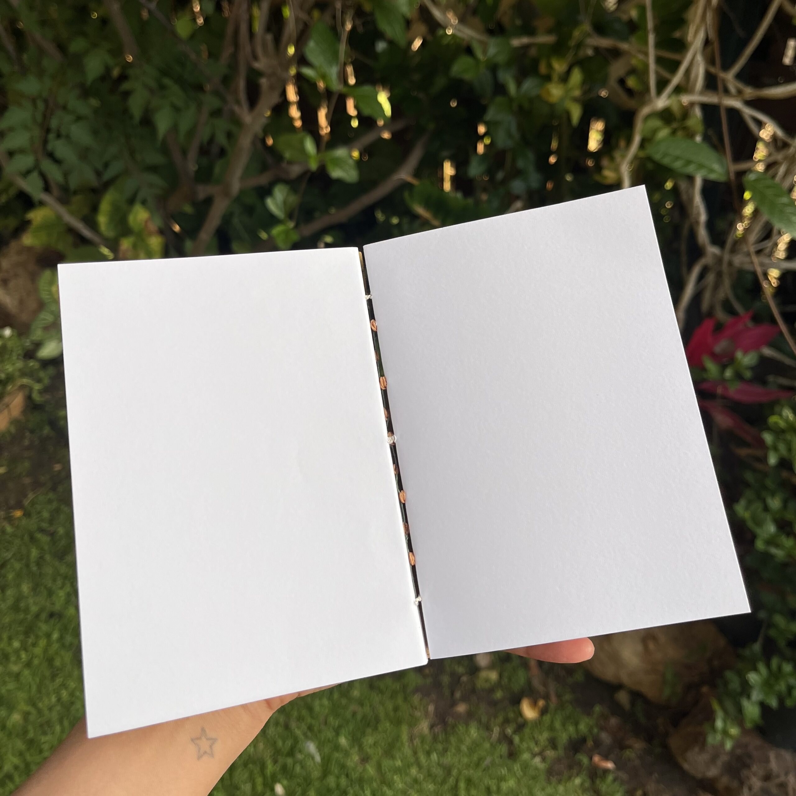 Made from secondhand fabric discovered in a local op shop. Handbound with 110gsm paper and coptic stitch.