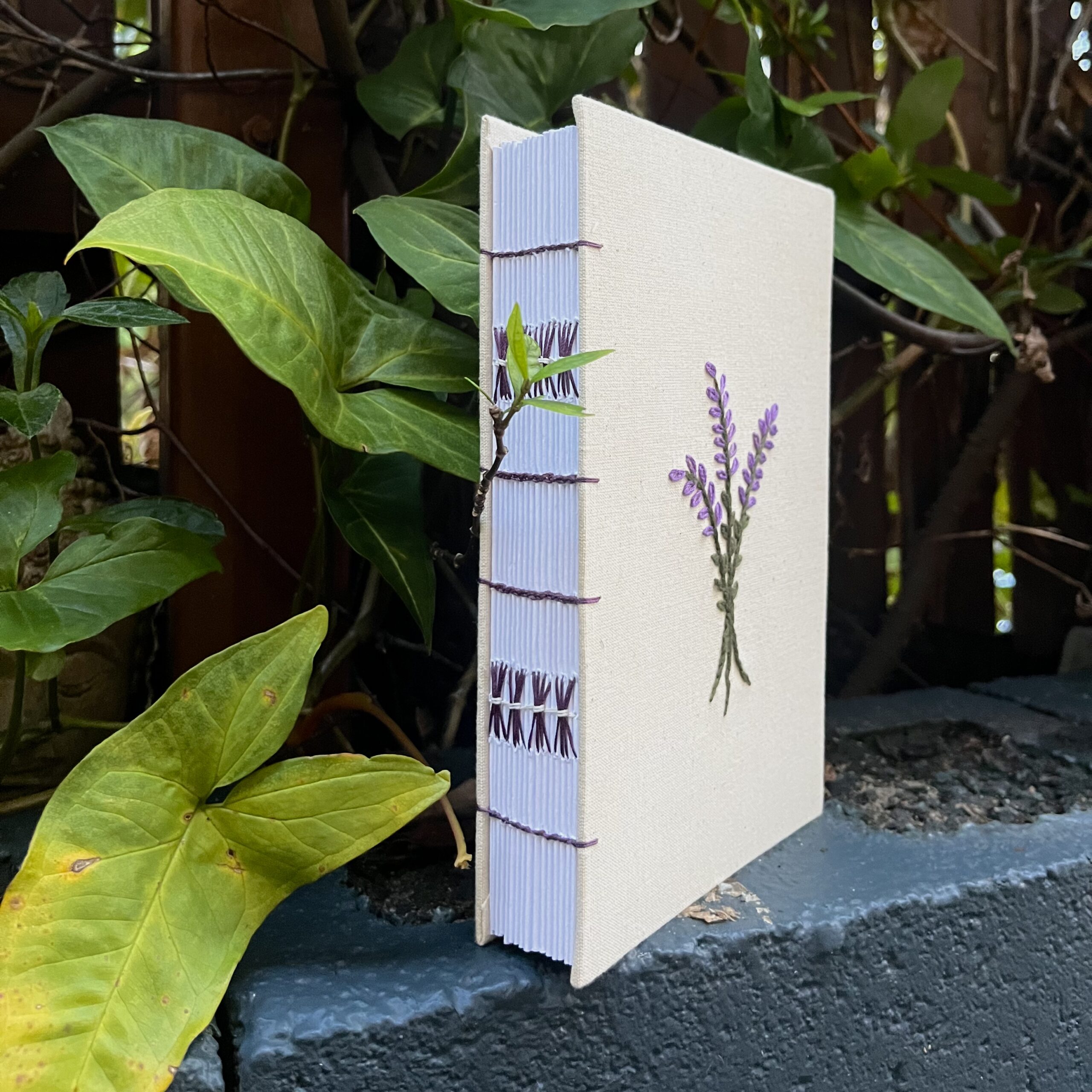 “Lavender Mist” ~ Made from secondhand fabric found in a local op shop and finished with hand embroidery. Handbound with 110gsm paper using coptic stitch.