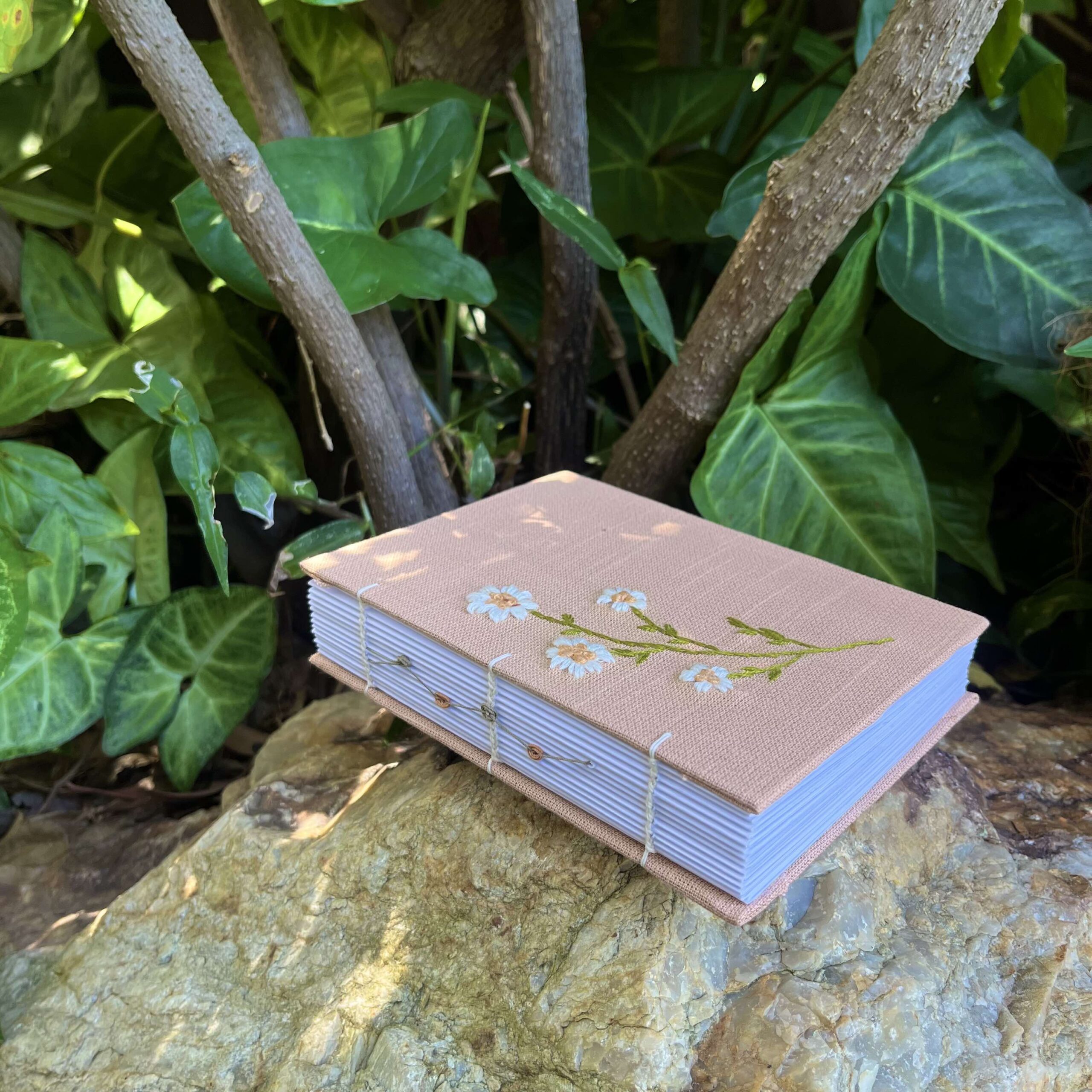 “October Daisy” ~ Made from secondhand fabric found in a local op shop and finished with hand embroidery. Handbound with 110gsm paper using coptic stitch.