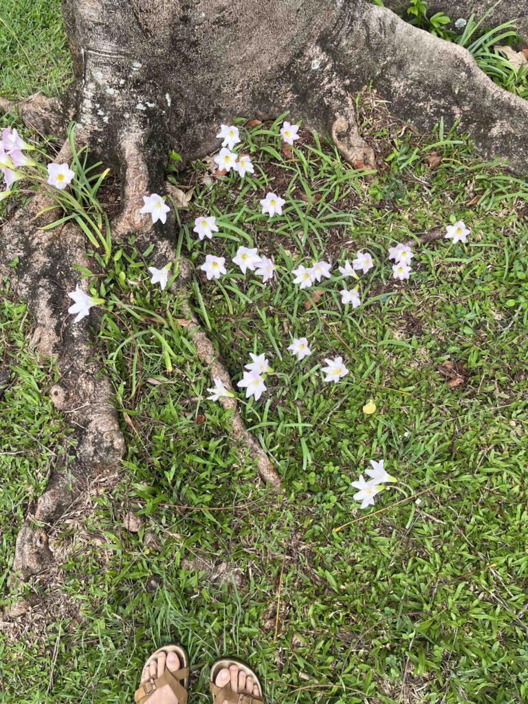 Today at work, MJ spotted the pink rain lily blooming beneath the tree in our office backyard garden. Everyone got excited to see the flowers after the rain. We all went outside to appreciate this lovely little surprise from nature and to say hello to the owl family. MJ said they had visited us last year.